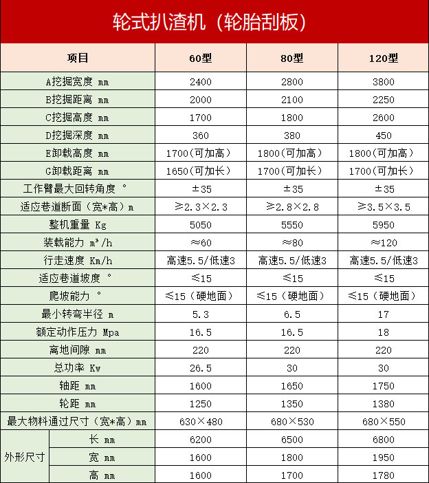 輪式扒渣機(又名挖掘式裝載機),主要應用於空間狹窄的洞采作業,如金屬礦,飲水巷道等,其作用是采集各工程的碎石土料並輸送、裝車。本機靠輪胎推進鏟取岩石並通過鏟鬥將石料扒進自身的皮帶輸送機,輸送機從尾部將挖取的岩石渣料卸入自卸汽車、礦車或其他裝載設備。同時也可以利用反鏟挖掘臂扒取遠處的岩石,也可以用鏟鬥來清理工作麵。