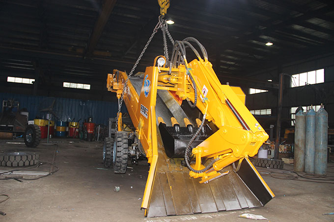 小型輪胎式挖掘裝載機(小型扒渣機)是一種連續生產的出礦設備。主要用於空間狹窄的洞采作業,如金屬礦,引水巷道等,其作用是采集各工程的碎石土料並輸送、裝車。本機靠輪胎推進鏟取岩石並通過鏟鬥將石料扒進自身的皮帶輸送機,輸送機從尾部將岩石卸入自卸車、礦車。同時也可利用反鏟挖掘臂扒取遠處的岩石,也可以用鏟鬥來清理工作麵。適用於斷麵為2.0米內(1.8*1.8米)的巷道。